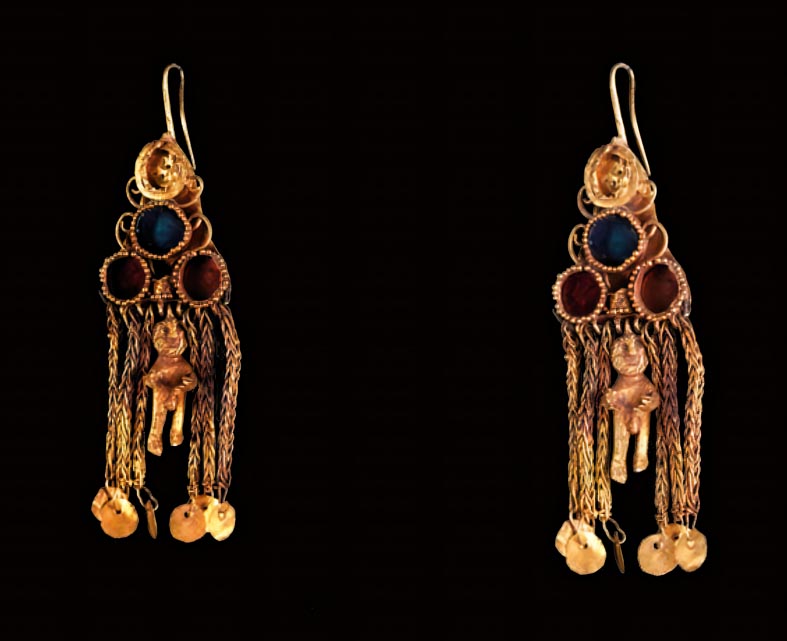 All these figurines have in common that they represent adult men with bald heads. Two of them are wearing conical helmets. Also, they all have long beards, twisted in plaits or braided, which they held in one or both hands. All figurines are made in a lotus position, or sitting on a decorated throne.